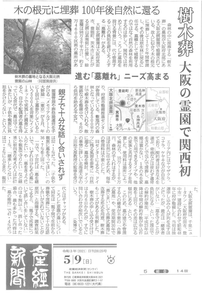 産経新聞が、私どもの樹木葬を取り上げて下さいました。