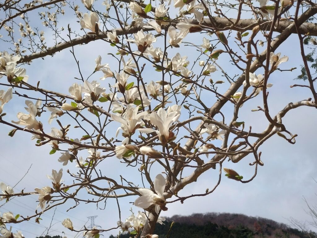満開のコブシが優雅に咲き誇る中、この樹木はまだたくさんの蕾を大切に抱えています。