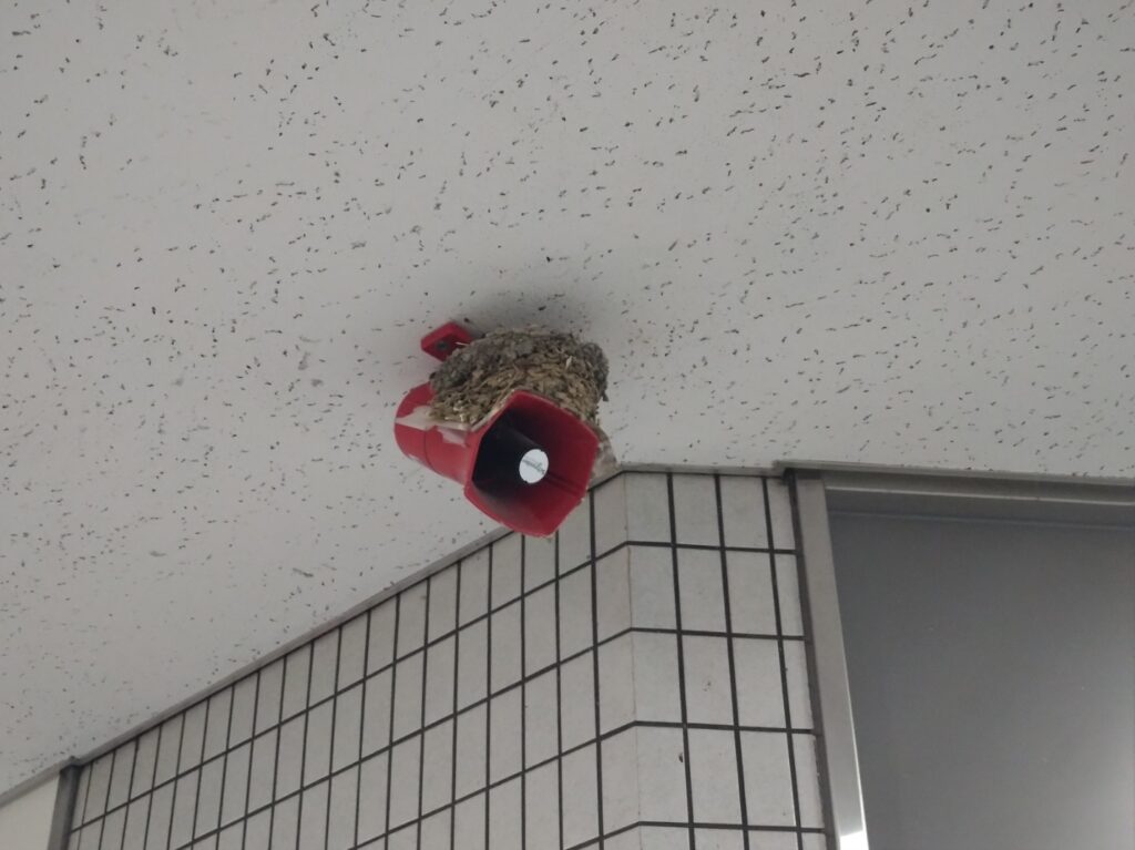 その巣は、大阪北摂霊園北千里オフィス近くの「ORIGIN」の看板横、スピーカーの上に作られたものです。(写真の右上)