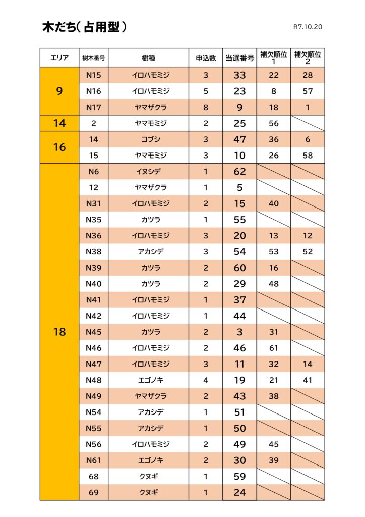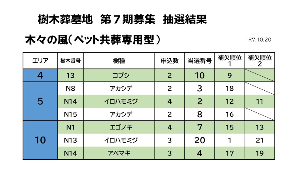 お知らせ・ブログ ホームお知らせ・ブログ樹木葬 第7期募集の抽選結果について お知らせ 2025.10.20 樹木葬 第7期募集の抽選結果について 大阪北摂霊園の樹木葬「木もれびと星の里」の第7期募集が終了しました。多くのお申込みをいただき誠にありがとうございました。 本日(10/20)、10時から大阪北摂霊園管理事務所2階において公開抽選を行いました。 抽選結果はこちらです。 当選された方には手続き書類をお送りいたしますので、11月28日(金)までにお手続きをお願いいたします。 お知らせ・ブログ一覧へ戻る お墓に関するご相談・お問合せ ご相談・お問合せ