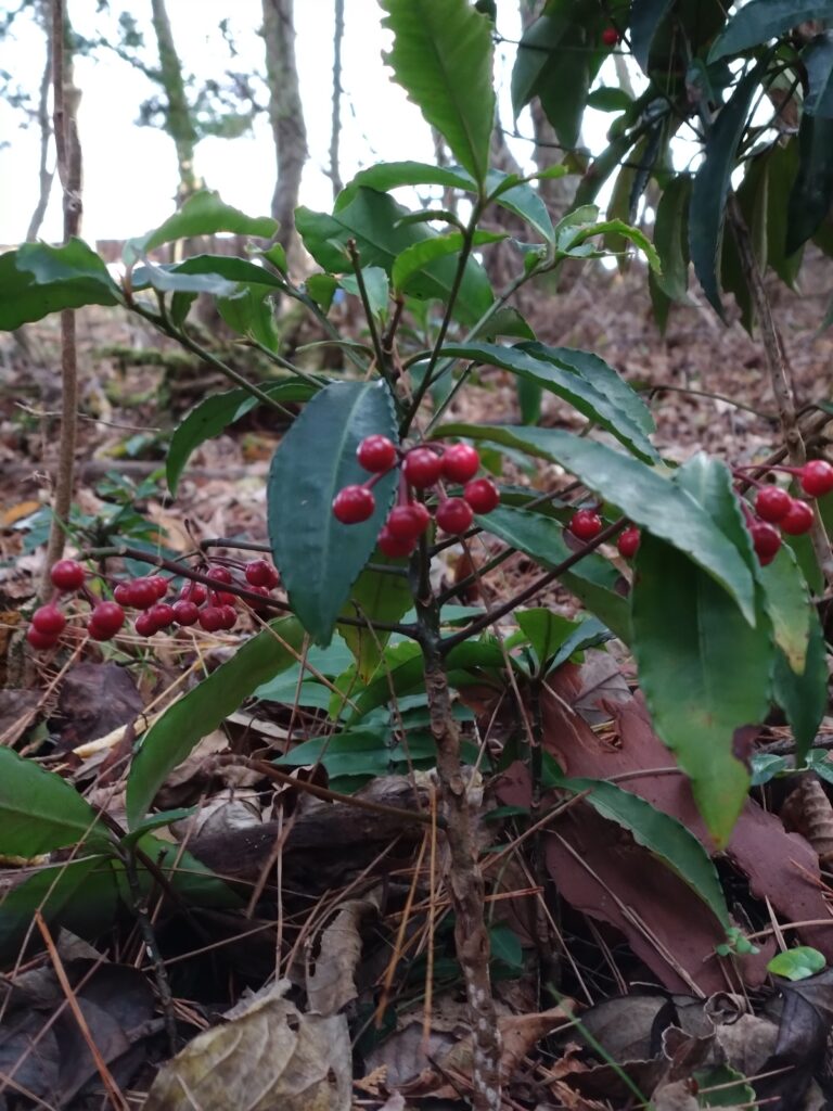 霊園で万両の木を見つけました。実が赤く正月の縁起物として使われています。