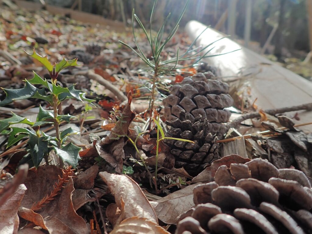 松ぼっくりの横に小さなヒイラギの幼木を見つけました。