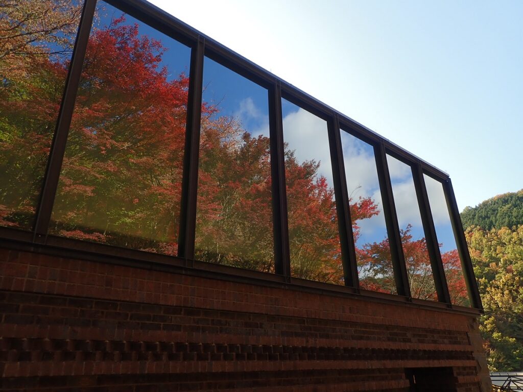 隣接する合葬式墓地に映りこんだ紅葉。(春には桜が映ります。)