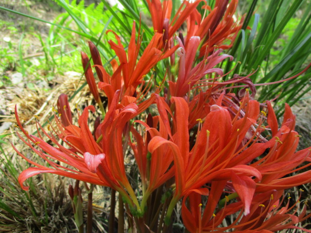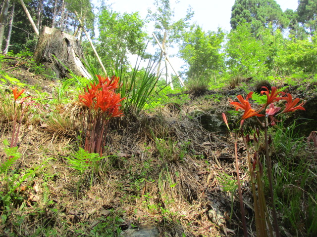 ヒガンバナ科の多年生の球根植物。明るい林床や林縁などに自生する。狭長の葉を球根から直接出して球根を太らせ、盆(8月なかば)前後になると花茎を 30〜50cmほど伸ばし、先端で枝分かれした先にいくつかの花を咲かせる。雌雄同花で花弁は橙色が6枚。葉の形や花と葉を別々に出すところ、有毒植物である点ではヒガンバナと共通するが、花の形および葉と花を出す時季は異なる。(ウィキペディアより一部抜粋)