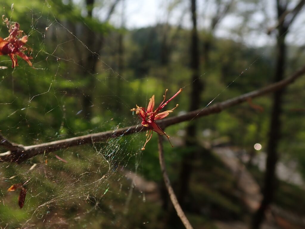 ヤマザクラのがくが蜘蛛の巣に引っかかって風に揺れていました。