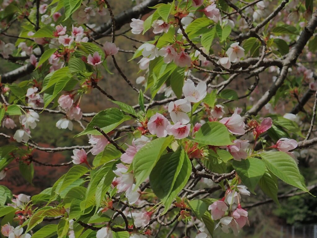 ヤマザクラの花や赤い葉と相まって美しい光景を生み出しています。
