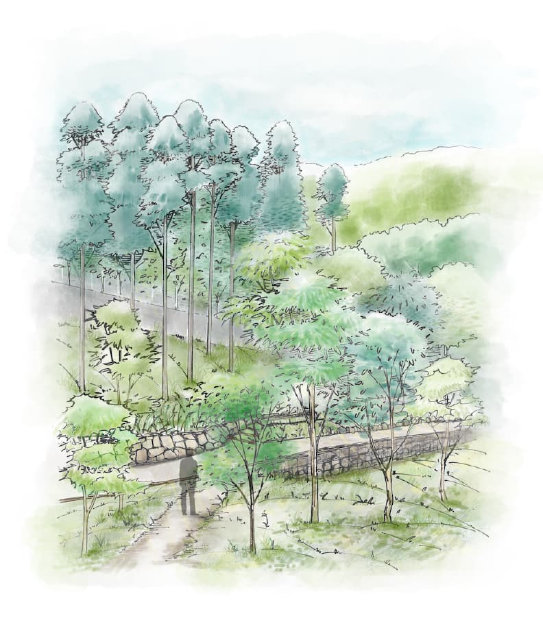 樹木葬墓地区画は、かつての薪炭林を基盤とした混交林と霊園造成時に植林された杉林でした。この地をやがて本来的な植生の見られる森へと還していくために、植生遷移に基づいたプログラムを検討し、そのきっかけとなる環境整備を行ったのがこの樹木葬墓地です。