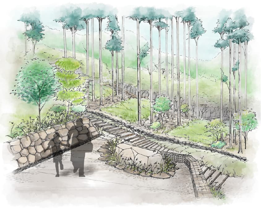 開園からしばらくは樹木が小さいかもしれませんが、日当たりの良い斜面地なので、やがて林床と共に緑に覆われていきます。同時にその落ち葉や枯れ草が土へと還り、豊かになった土から新たな植物が育つ。そうして季節を重ねながら、自然の植生が徐々に増えていくものと考えます。