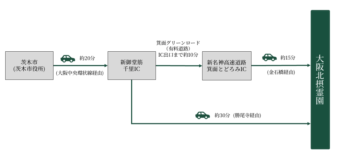 ※霊園内には墓所の近くまで、車が乗り入れできる駐車場がございます。 - 箕面グリーンロード経由:約45分