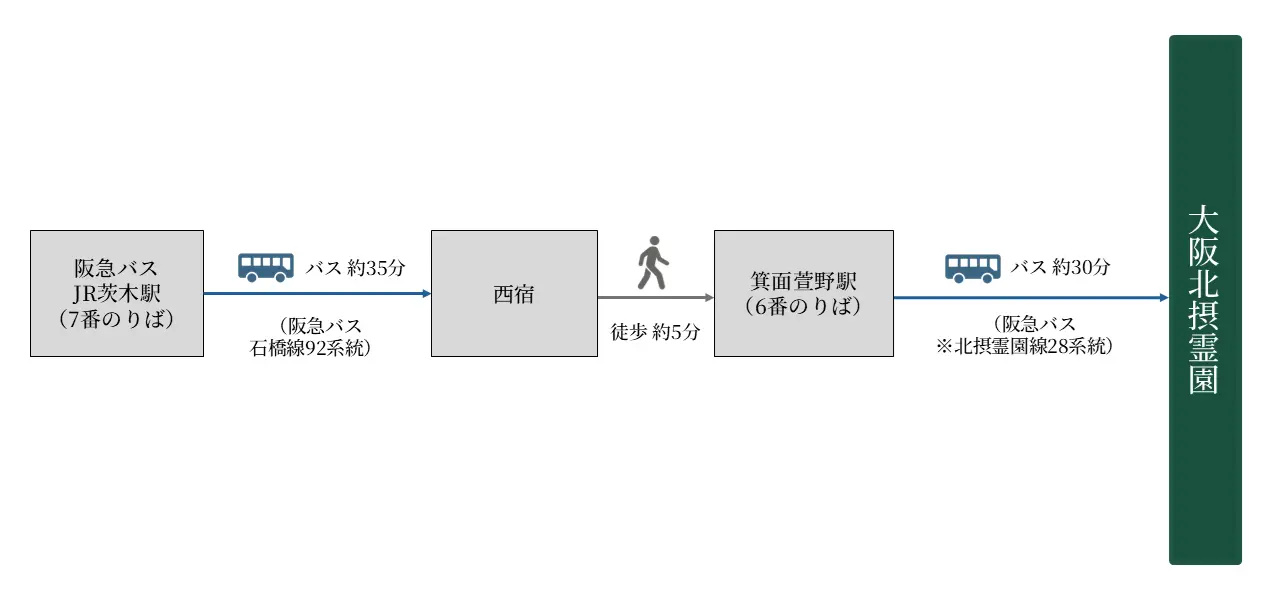 (北摂霊園線28系統/6番のりば):約30分 - 料金の目安:約920円
