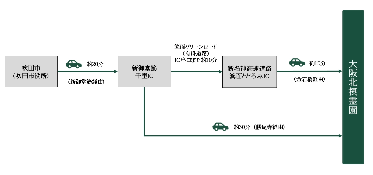 ※霊園内には墓所の近くまで、車が乗り入れできる駐車場がございます。 - 箕面グリーンロード経由:約45分