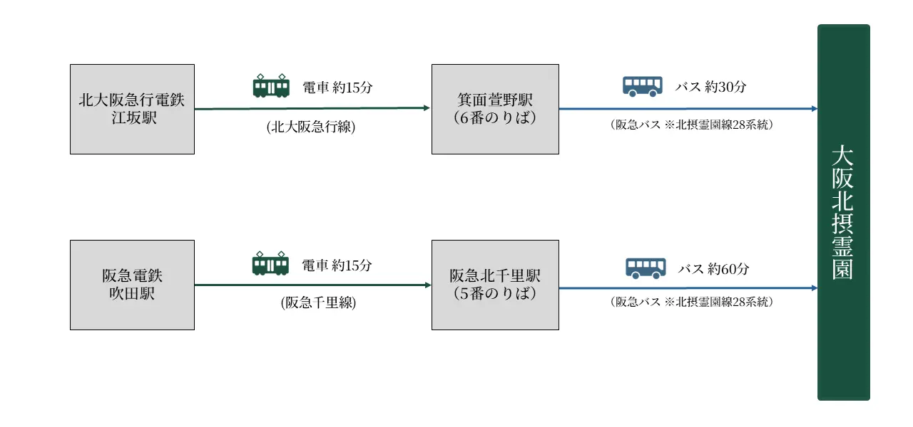 (北摂霊園線28系統/5番のりば):約60分 - 料金の目安:約970円